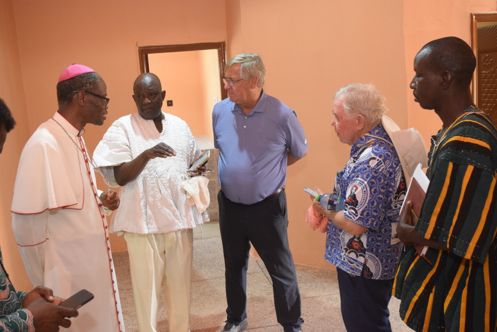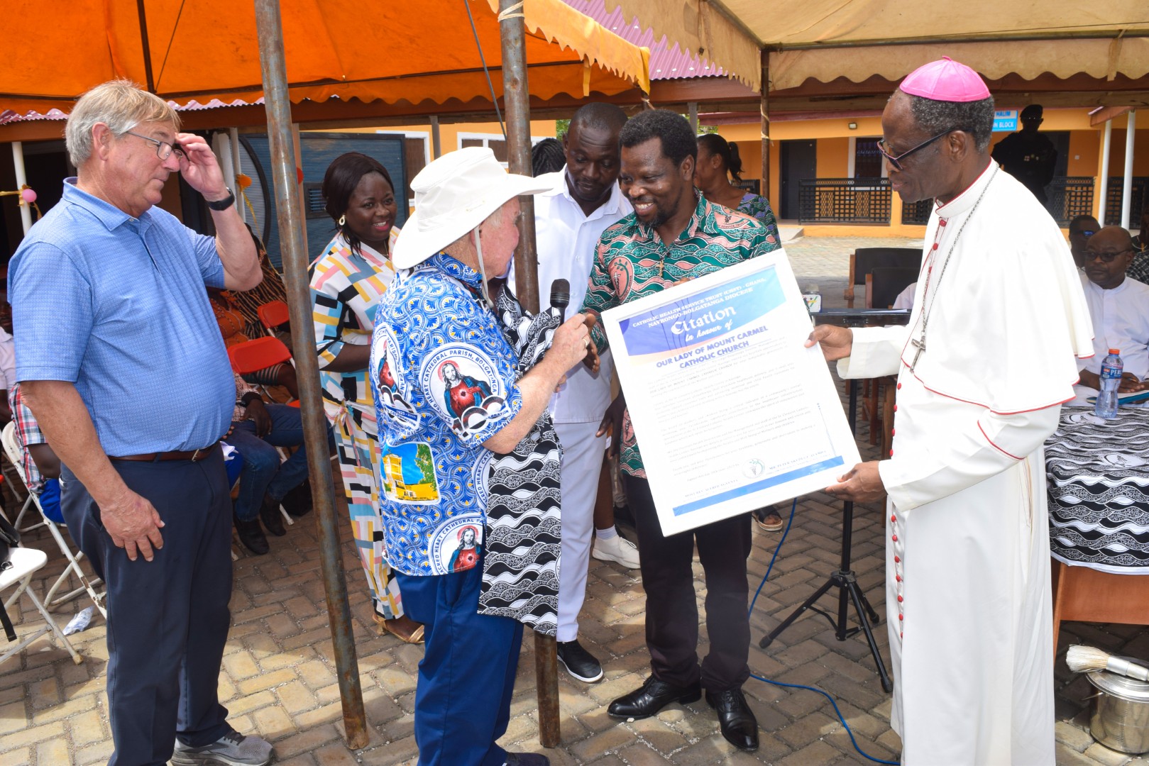 The Bishop of Navrongo-Bolgatanga presents a citation to Scott and Deacon Steve, representing Our Lady of Mount Carmel Parish and St. John Vianney Chapel.